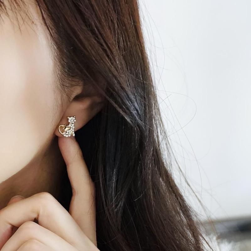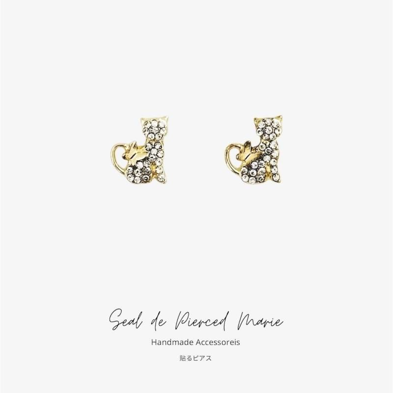 小さなラインストーンがきらめく、猫モチーフの貼るピアス。スタッドタイプのすっきりとしたデザインで、上品さの中にほんのり遊び心が感じられます。ストーンの輝きが耳元でさりげなく光り、普段使いはもちろん、お出かけコーデにも華やかさをプラス。小ぶりでも存在感があり、大人の可愛さを楽しめる人気のデザインです。