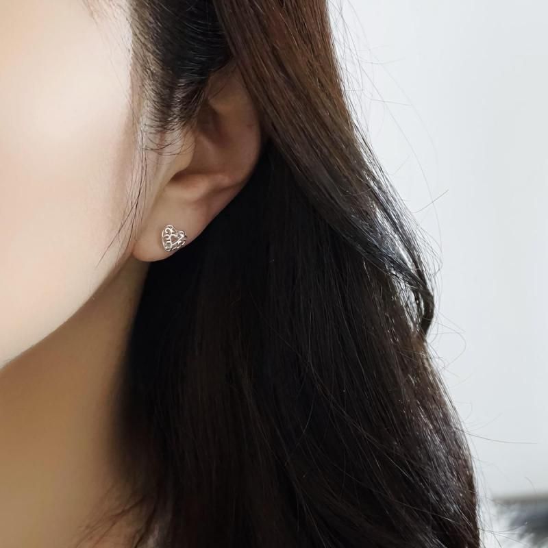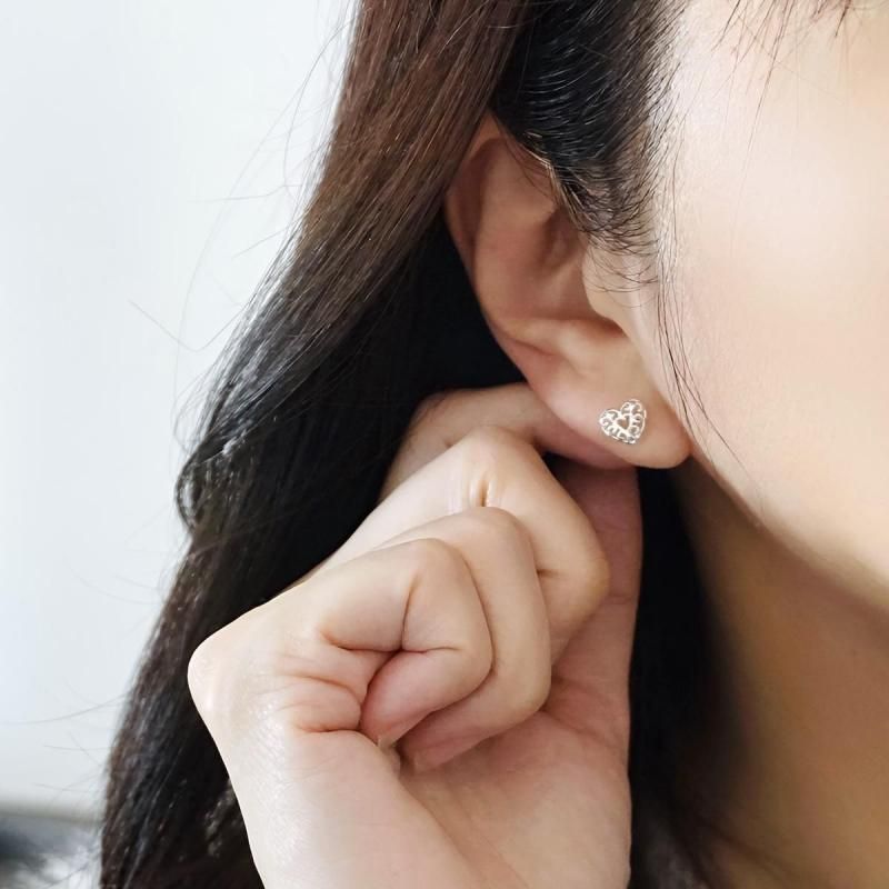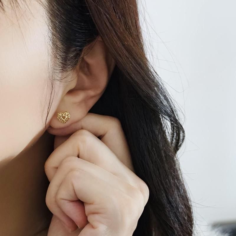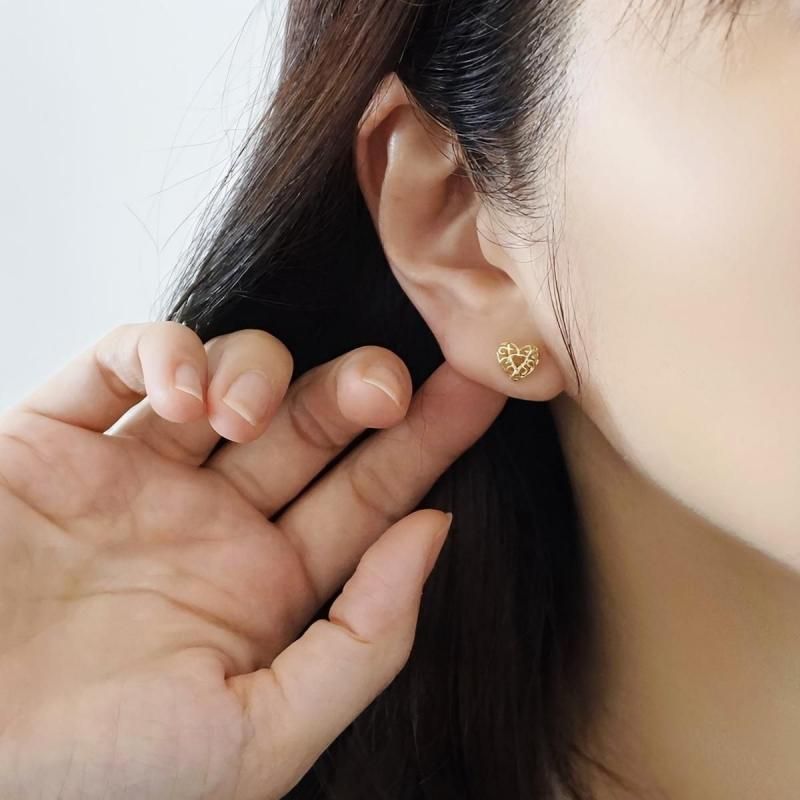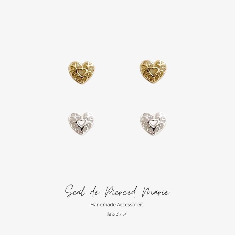 透かし模様が施された小さなハートが可愛い、メタル素材の貼るピアスです。繊細なディテールが耳元でさりげなく輝き、シンプルながら存在感のあるデザインに。