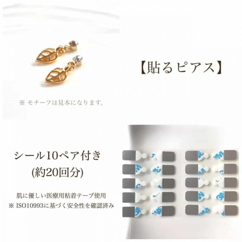 当店の貼るピアスは、3M社製の医療用粘着テープを使用。デリケートな肌にも優しく、お肌の弱い方でも安心してお使いいただけます。しっかりとした粘着力で取れにくく、ピアスのような見た目と、軽くて痛くない着け心地にこだわりました。幅広い年齢層におしゃれを楽しんでいただけるオリジナルデザインで、シール10ペア付きなので繰り返し使えます。